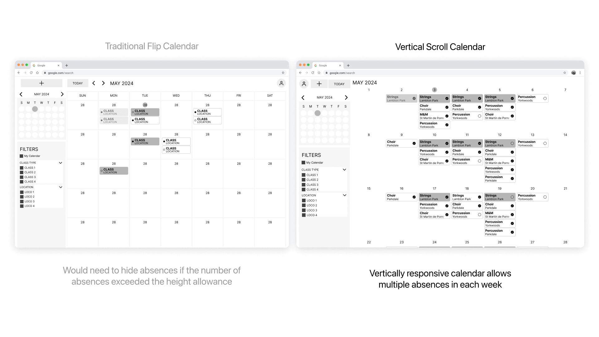 The first roadblock we hit was the decision of whether to choose the conventional calendar navigation (left-right flip), or use a vertically scrolling calendar instead.