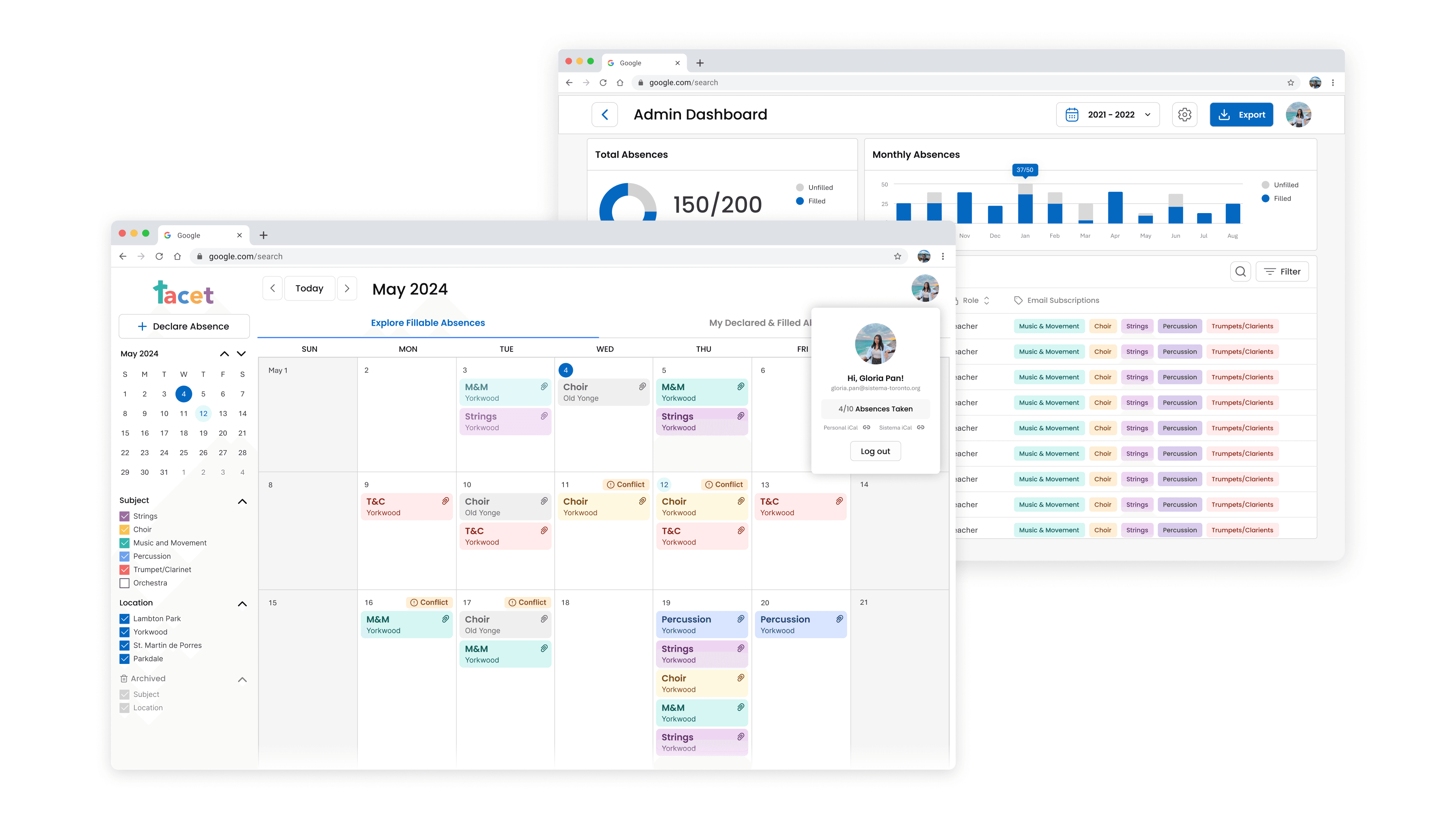 An optimized absence management system that reduces administrative overhead, and enhances visibility of teacher availabilities.