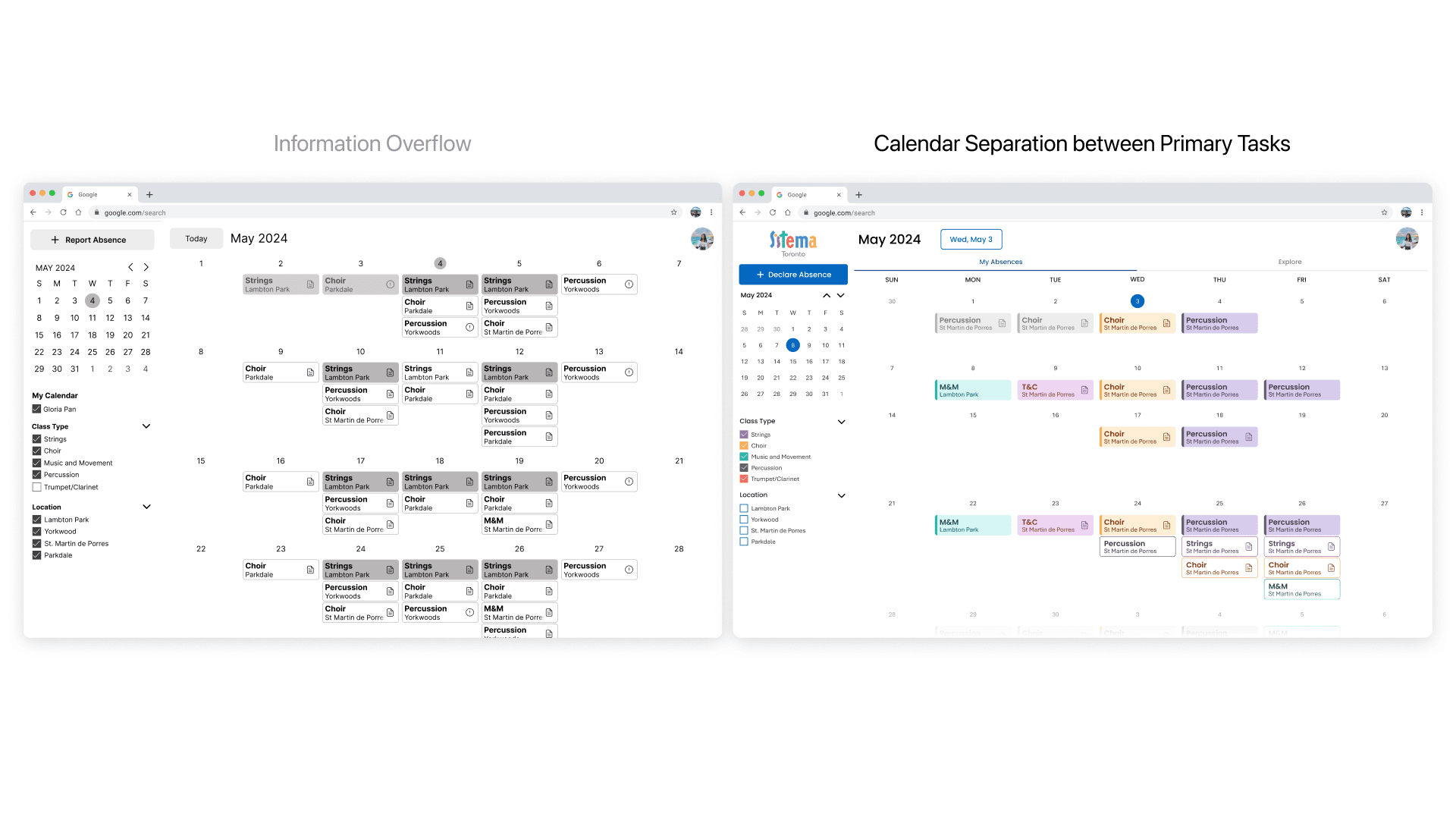 After conducting the user tests, we found that many of the problems came back to the same problem of poor information architecture. We revisited the primary tasks that the teachers had, and found that they would be going on Tacet to either (1) declare and absence or (2) fill for another teacher. We decided to split those two tasks into separate calendars.