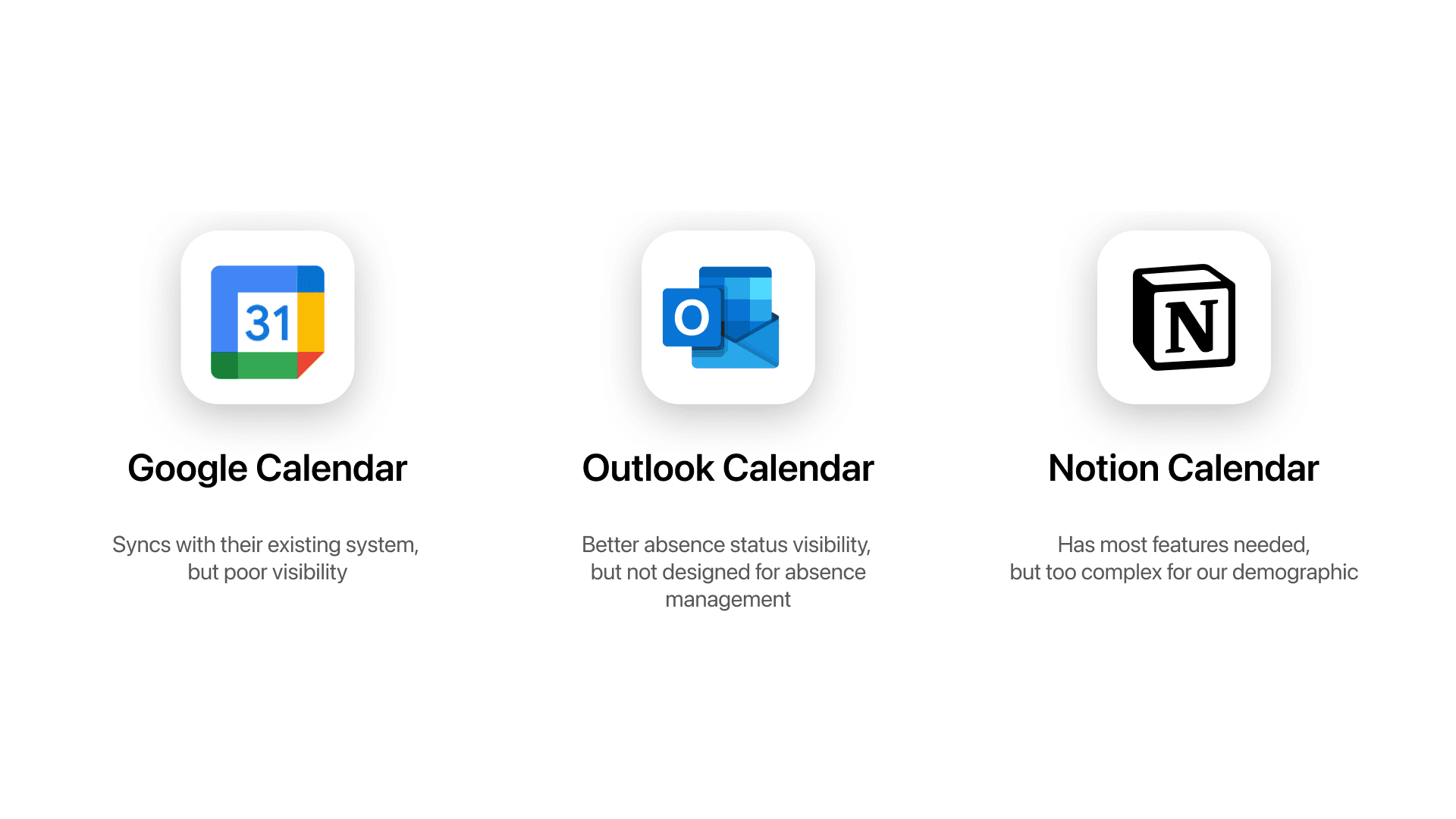 To make sure we aren't creating something that has already been made, we took a look at the pros and cons of the current market of the most popular apps that could be used within the Sistema team for absence tracking.