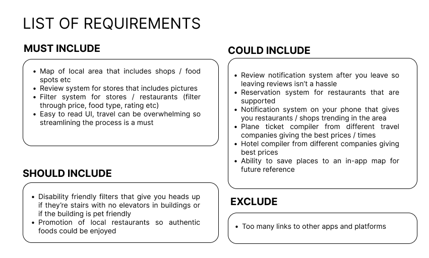 Based on our findings of our user interviews we compiled a list of requirements for our product, followed by some user personas to better understand our audience.