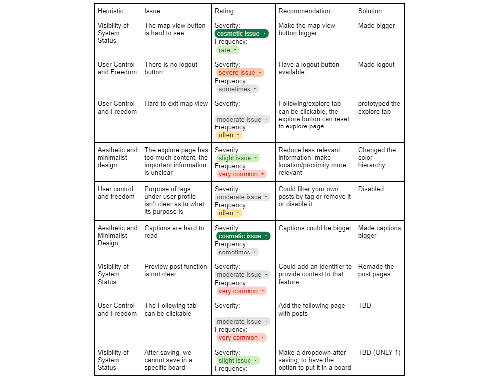 Our heuristic evaluations pointed out some flawed design choices we made throughout the process, pointing out issues and bugs in the 10 heuristic categories. Mainly changing the visibility of the system status as it seemed unclear during the user interview.