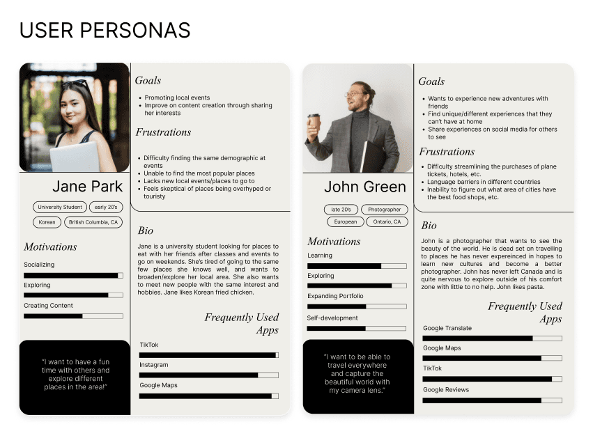 Through our interviews, we found that travelers aged 19-24 found it hard to find the right places to go for attractions, and there is no definitive app that does it all. Participants stated they used multiple apps during their travels, whether it be for trendy recommendations or reputable reviews.