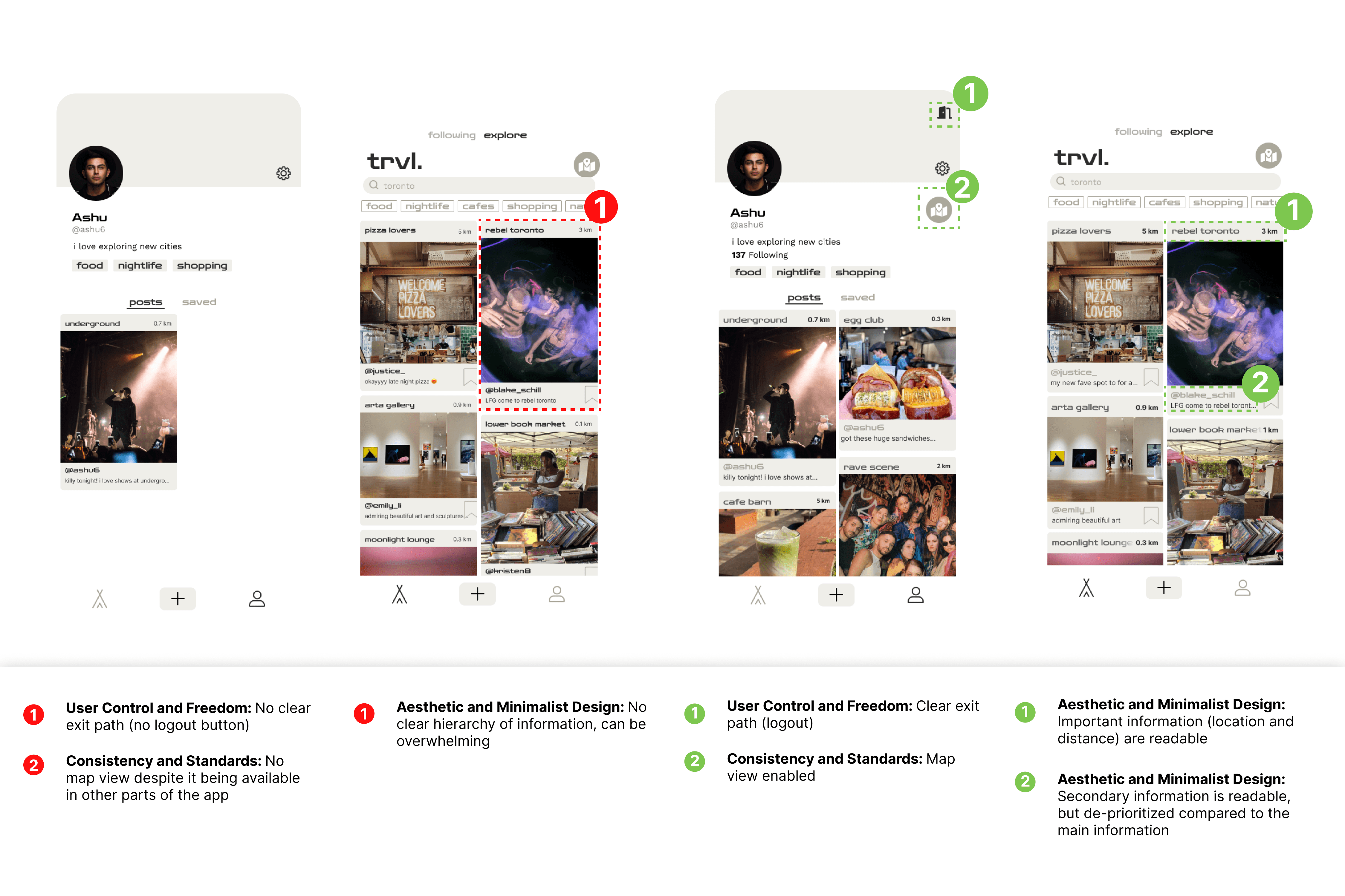 Main user task is on the feed, featuring both masonry layout and map view showing the local attractions. Feed allows for filtering based on what you’re searching for which makes finding places to go enjoyable.